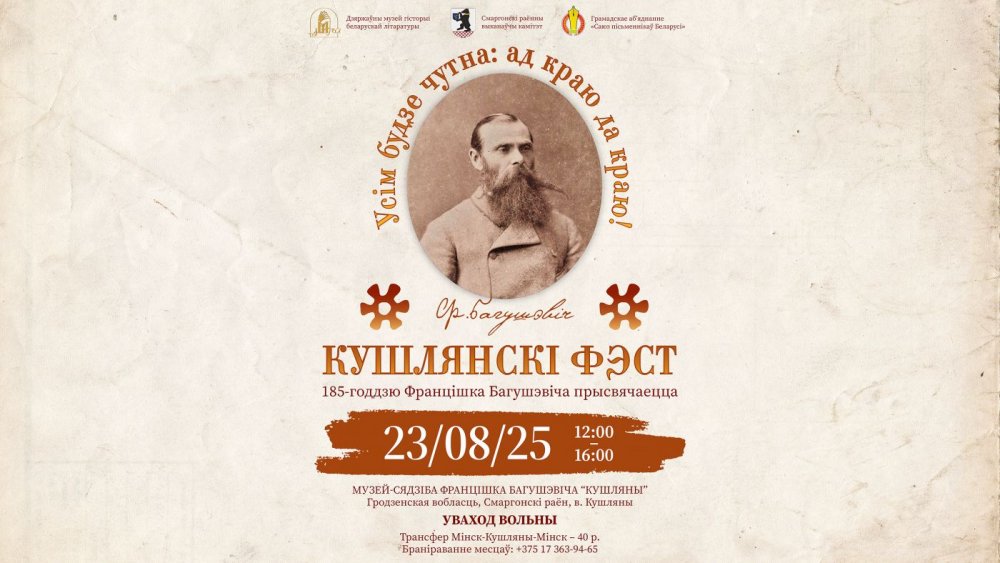 23 жніўня 2025 г. Дзяржаўны музей гісторыі беларускай літаратуры запрашае на “Кушлянскі фэст” – традыцыйнае літаратурна-музычнае свята, якое ладзіцца ў філіяле “Музей-сядзіба Францішка Багушэвіча “Кушляны” (Смаргонскі раён). Сёлета фэст будзе прысвечаны юбілейнай даце – 185-годдзю з дня нараджэння знакамітага паэта, публіцыста, перакладчыка, адваката і грамадскага дзеяча Францішка Казіміравіча Багушэвіча.
